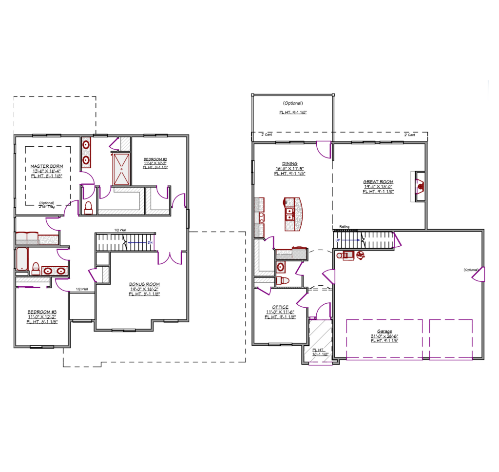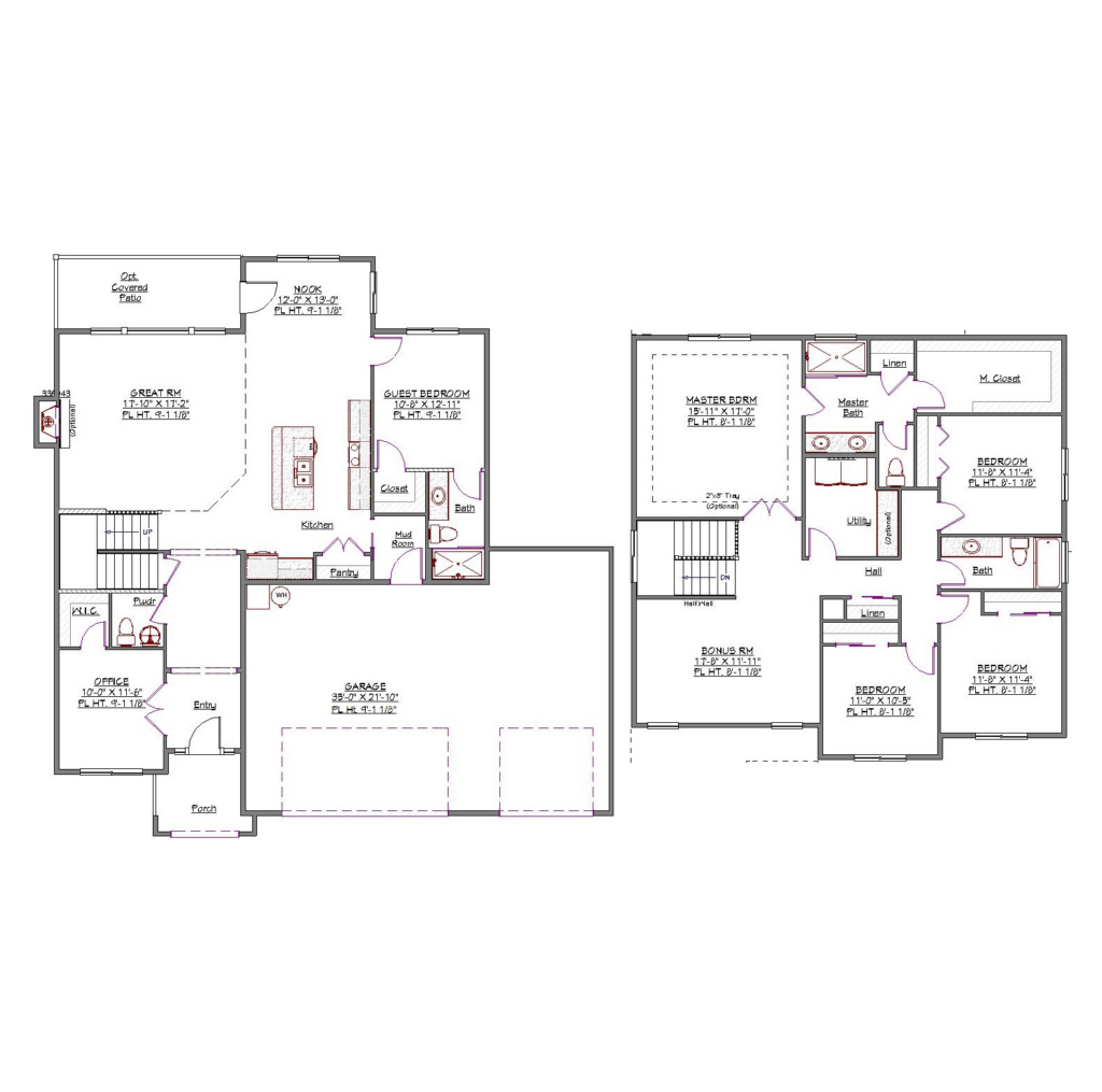 This expansive layout offers a master suite on the main floor, two additional bedrooms, a private office, and a bonus room. The open plan connects the great room to the dining area and kitchen.