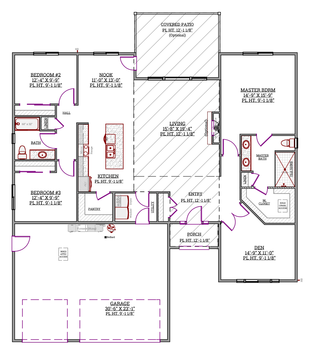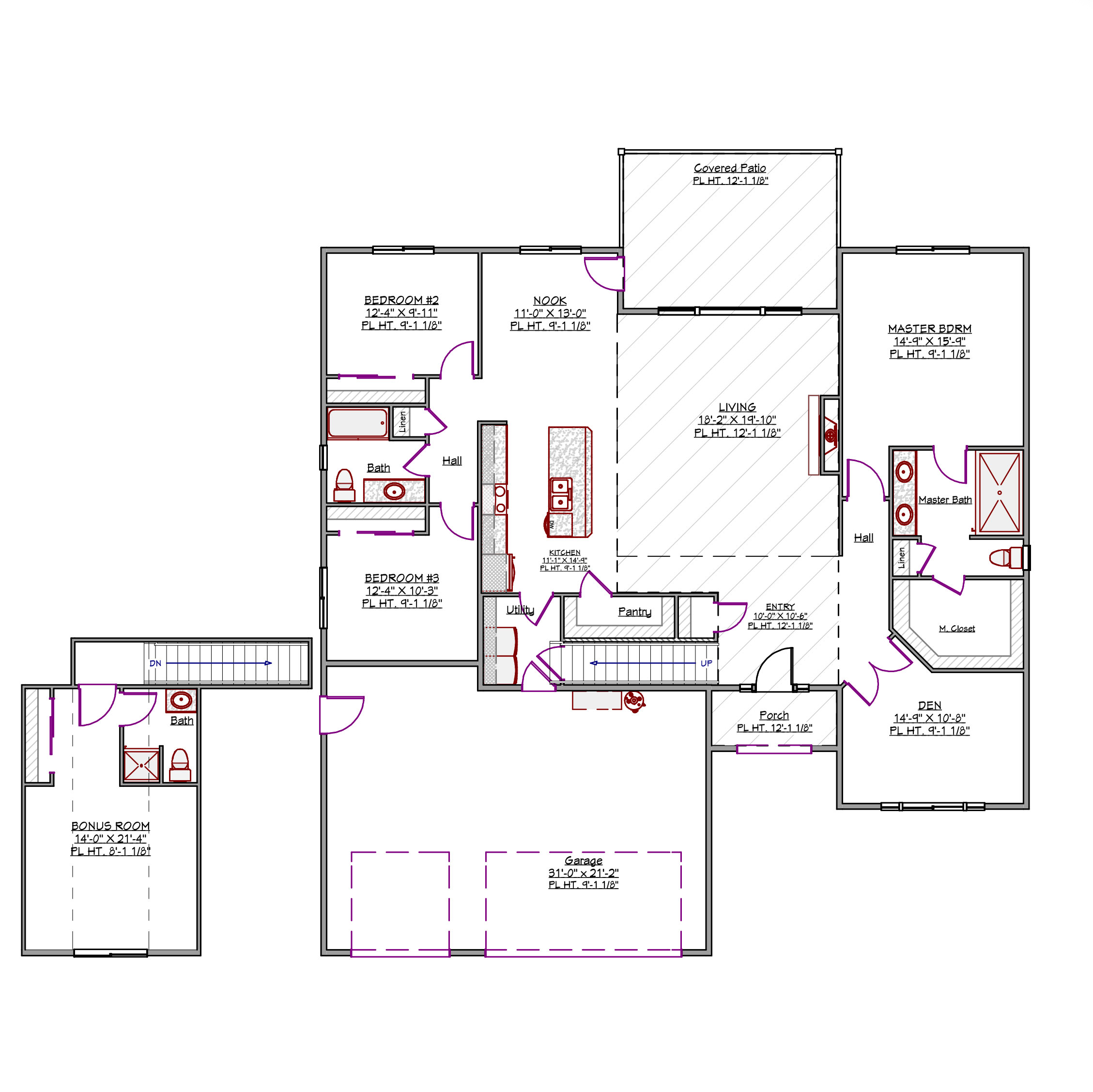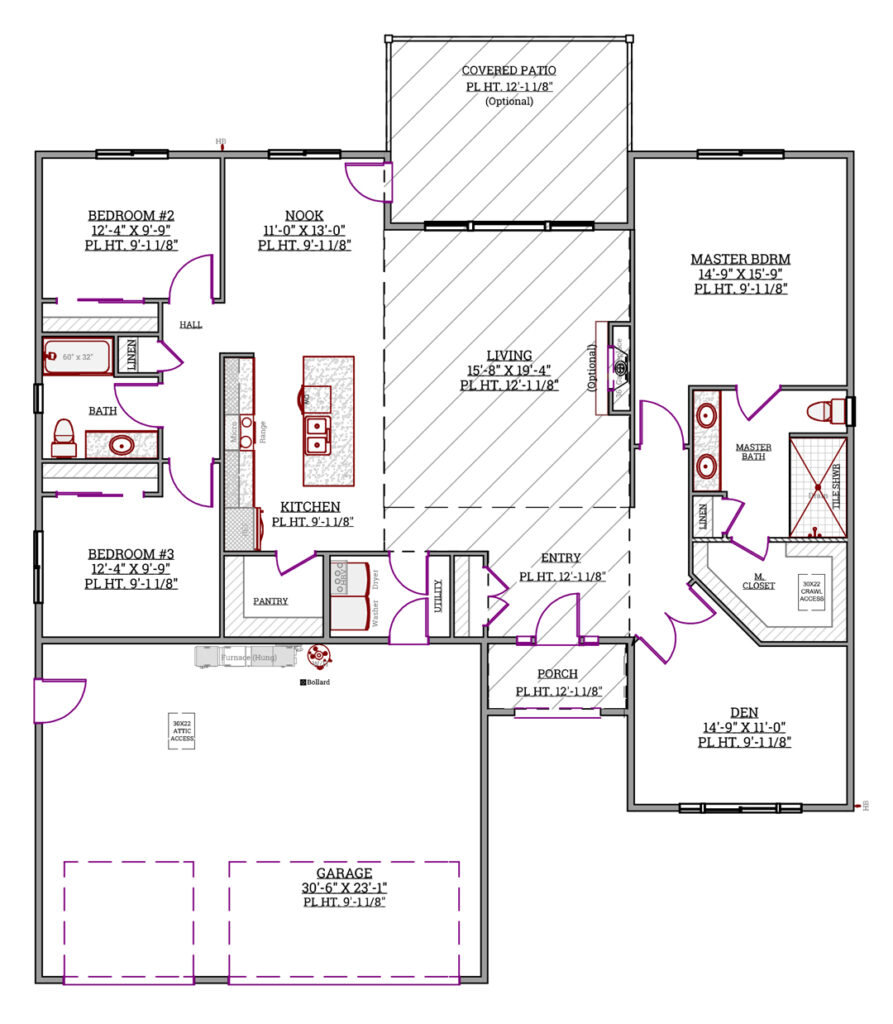 The layout includes a master suite with a private bathroom, two additional bedrooms, a versatile den, and a centrally located living area that connects to the kitchen and nook.