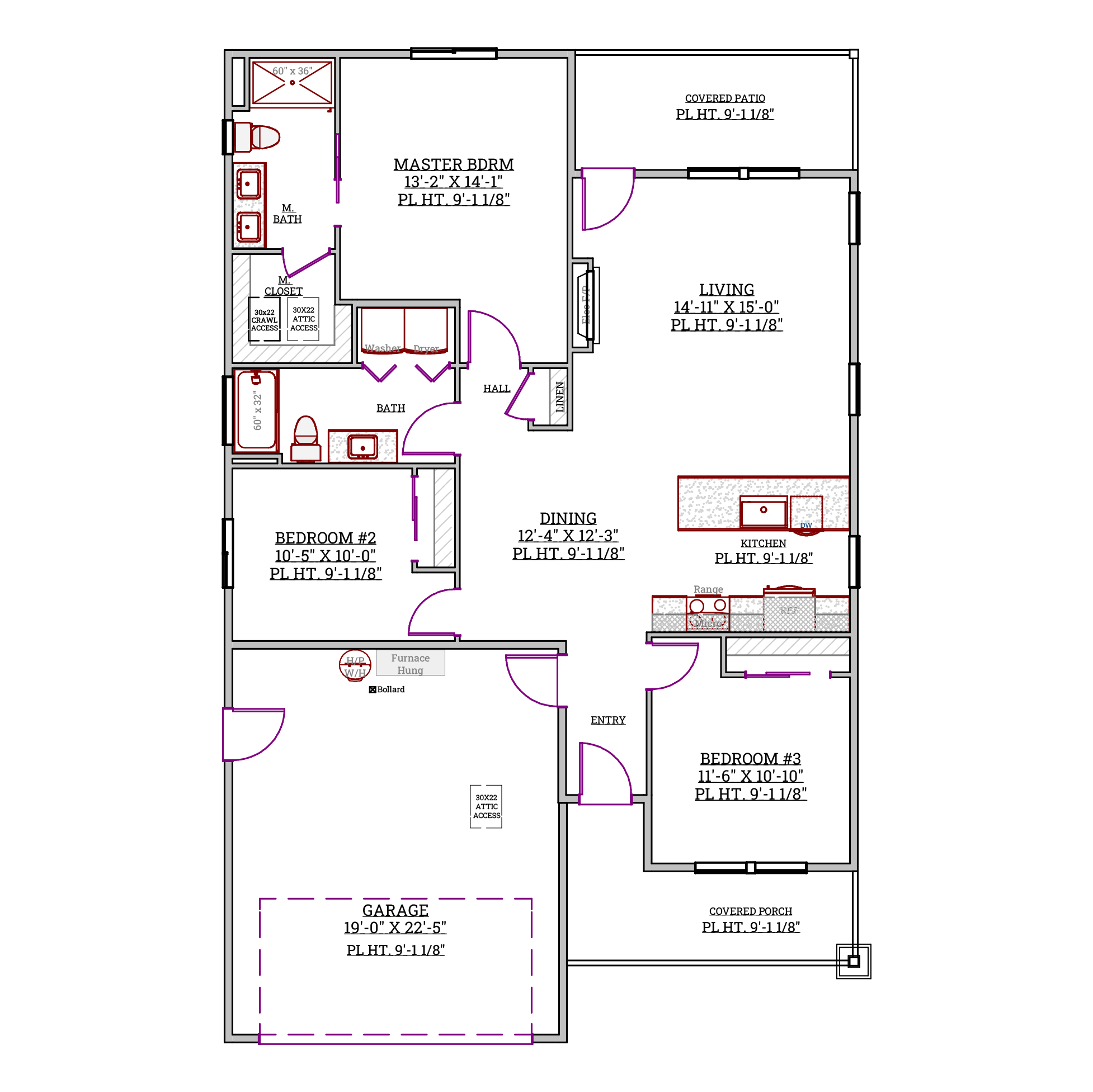 This floorplan features a master bedroom with an ensuite bathroom and walk-in closet, two additional bedrooms, a central living room, and utility spaces efficiently connected to the kitchen.